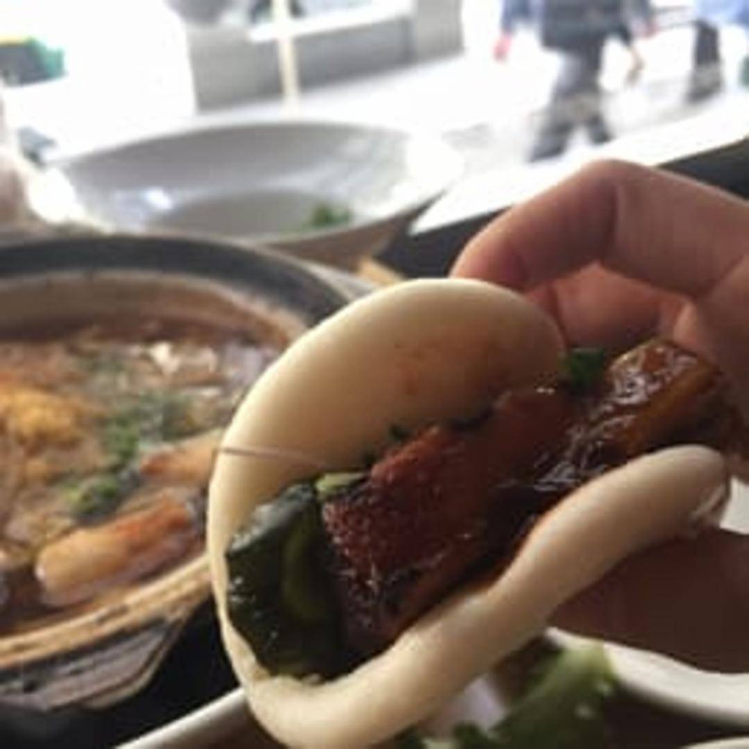Steamed, fluffy buns filled with tender, savory pork. The pork is typically slow-cooked and braised, resulting in a rich and flavorful filling. Often served with a slightly sweet and tangy sauce for dipping or drizzling. Buns are typically served in pairs.