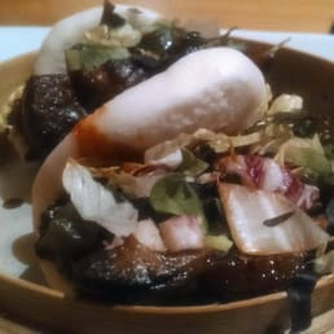 Slow-braised pork belly, expertly seasoned and seared to a crispy perfection. Served with a complementary glaze and garnish, often including pickled vegetables or a fresh herb accent.