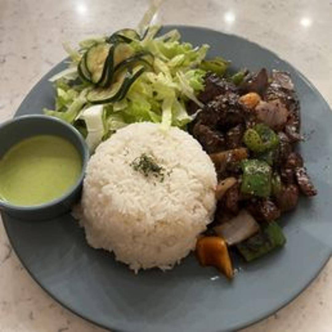 A combination rice plate featuring a variety of savory toppings and sides, served with steamed rice. Exact components may vary; please inquire with the restaurant for daily offerings.
