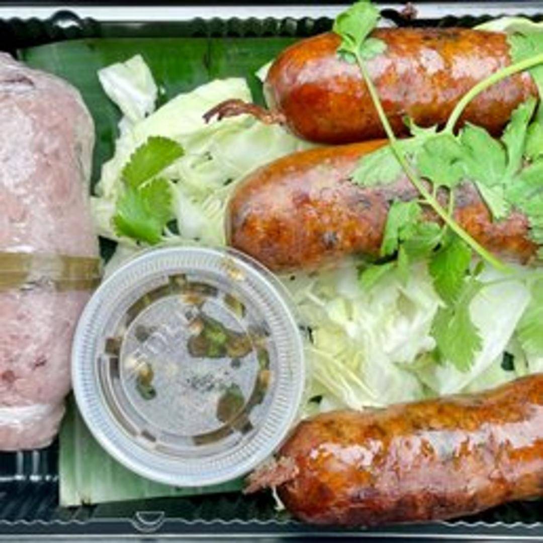 A flavorful assortment of Lao sausages, including traditional pork sausage (Sai Oua) and other regional specialties. Served grilled and sliced, offering a diverse taste of Lao flavors. Perfect for sharing and experiencing authentic Lao cuisine.