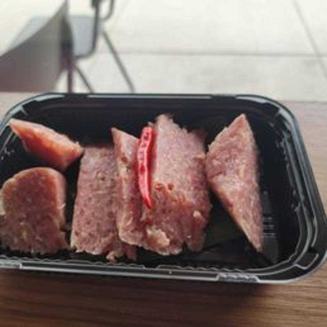 Thinly sliced, cured pork offering a savory and slightly salty flavor profile. Often used as a component in Banh Mi sandwiches, noodle dishes, and other Lao street food preparations. May be seasoned with garlic, pepper, or other traditional spices before curing. Expect a firm yet tender texture, ideal for complementing other ingredients.