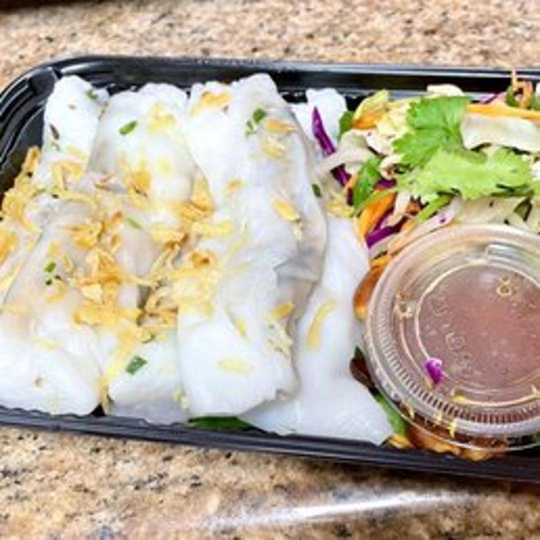 Steamed rice rolls filled with seasoned ground pork, wood ear mushrooms, and shallots. Served with a side of Vietnamese dipping sauce (nuoc cham) and fried shallots for added flavor and texture.