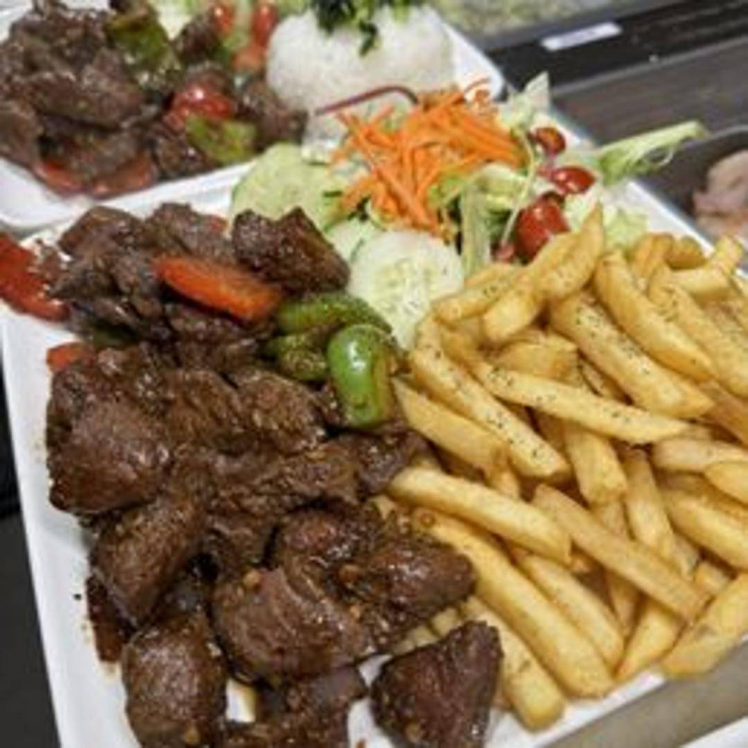 Cubed filet mignon stir-fried with onions, bell peppers, and a savory sauce. Served with rice.