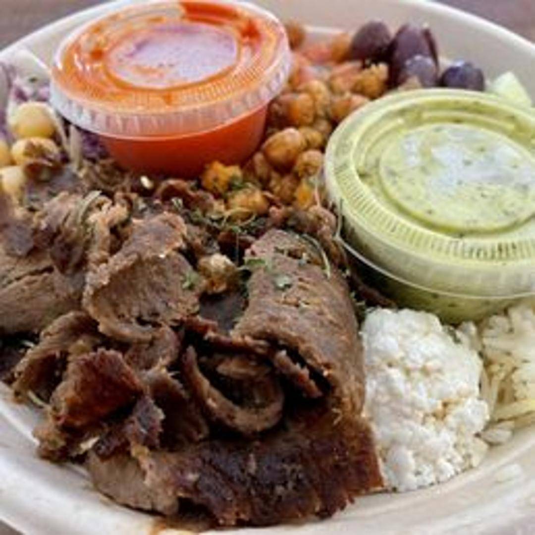 A customizable bowl with your choice of protein (Doner, Gyro, Falafel, or Veggie), base (rice, lentils, or mixed greens), toppings, and sauces.