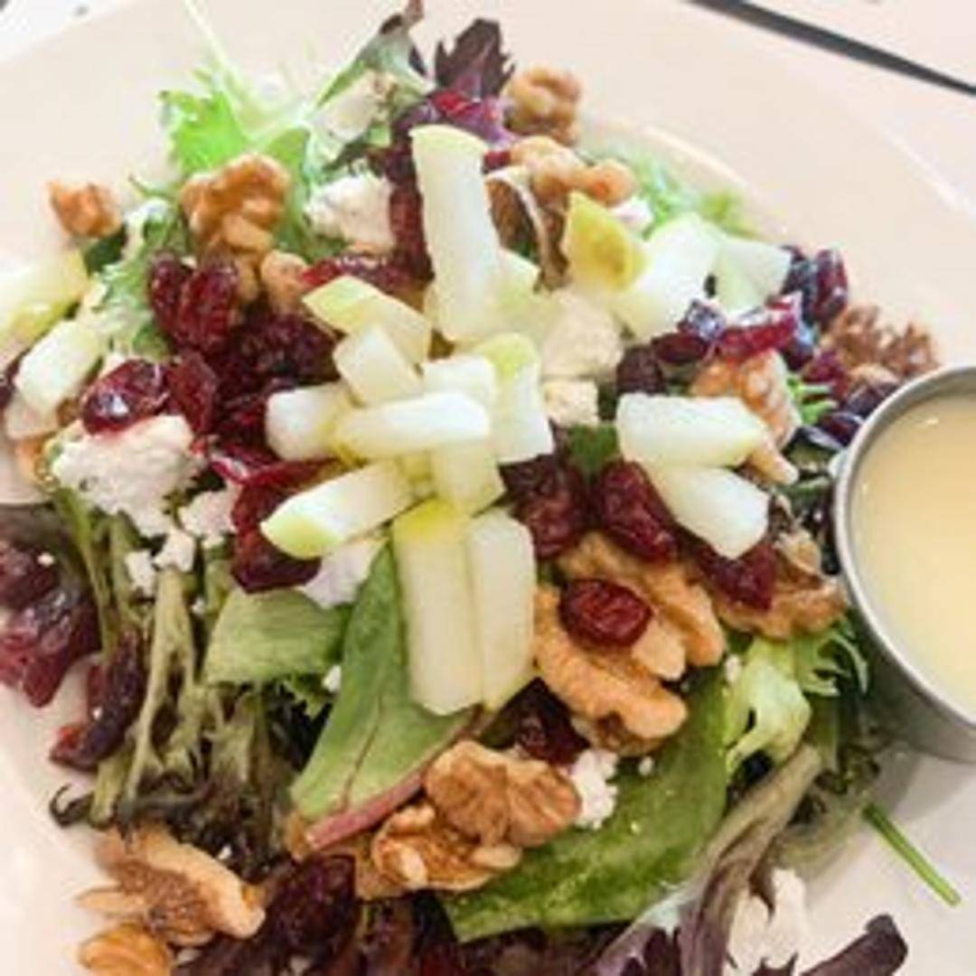 A delightful and refreshing salad combining crisp, sweet apple slices with the tangy creaminess of crumbled goat cheese. Tossed with fresh greens and often complemented by candied nuts or dried cranberries, all dressed in a light, vibrant vinaigrette for a harmonious blend of flavors.