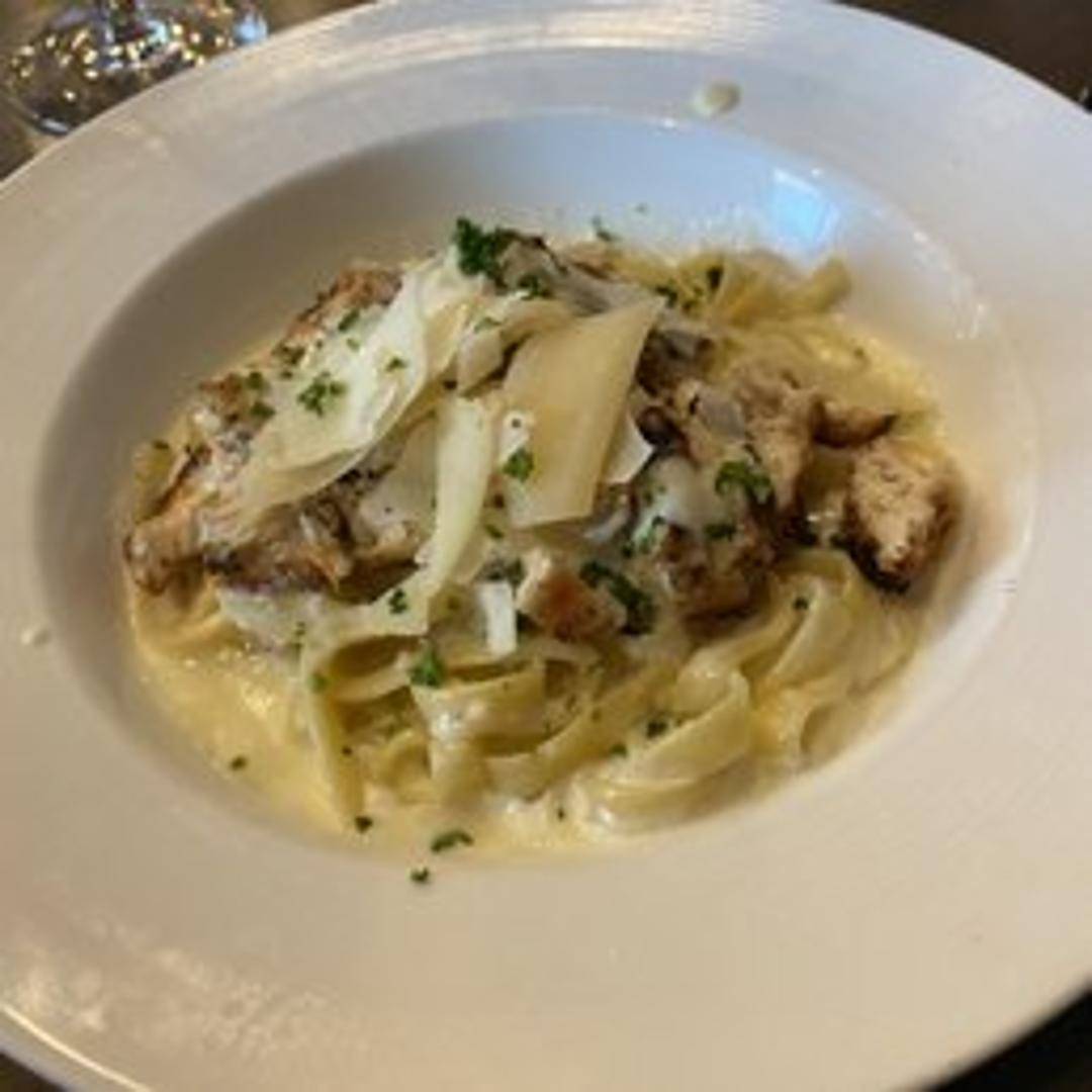 Indulge in a classic Italian masterpiece: al dente fettuccine pasta generously coated in a luxurious, velvety Alfredo sauce, crafted from rich butter, fresh cream, and aged Parmesan cheese, finished with a sprinkle of fresh parsley.
