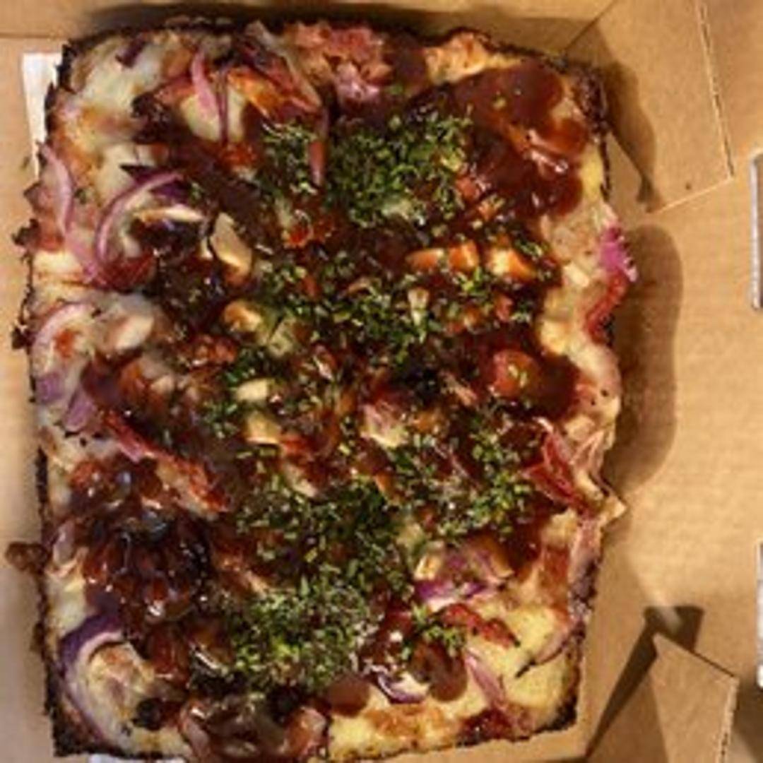 A flavorful pizza with a tangy BBQ sauce base, topped with grilled chicken, crispy bacon, red onions, mozzarella and cheddar cheese, and a sprinkle of cilantro.