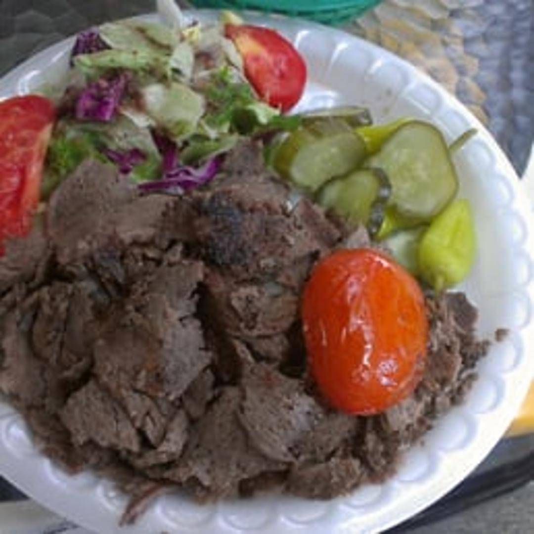Delicious doner kebab meat, thinly sliced and cooked on a vertical rotisserie. Served on a plate with rice, salad, hummus and pita bread.