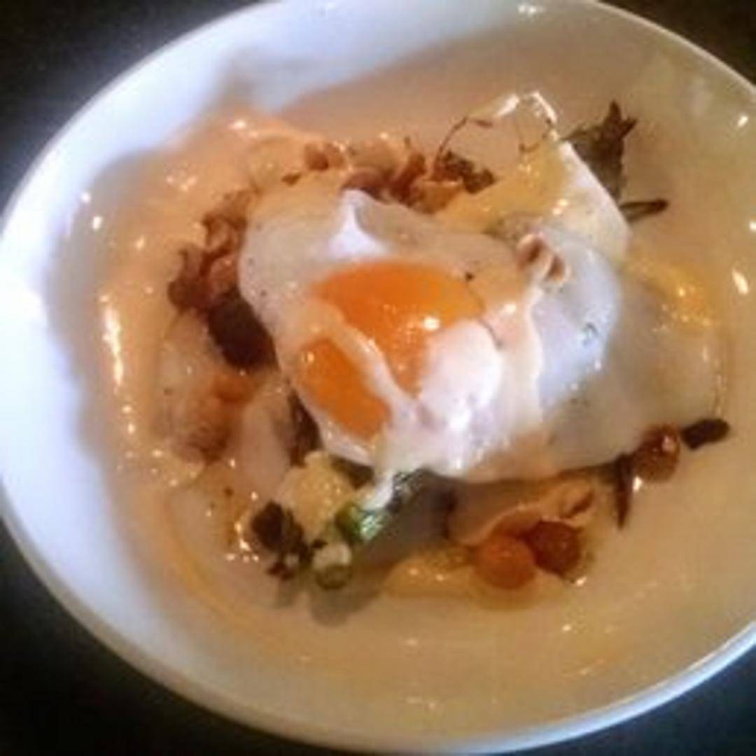 A perfectly cooked duck egg with a runny yolk and tender white. Served warm, often with accompaniments such as sea salt, black pepper, and potentially small toasts or dipping sauces to complement the rich flavor.