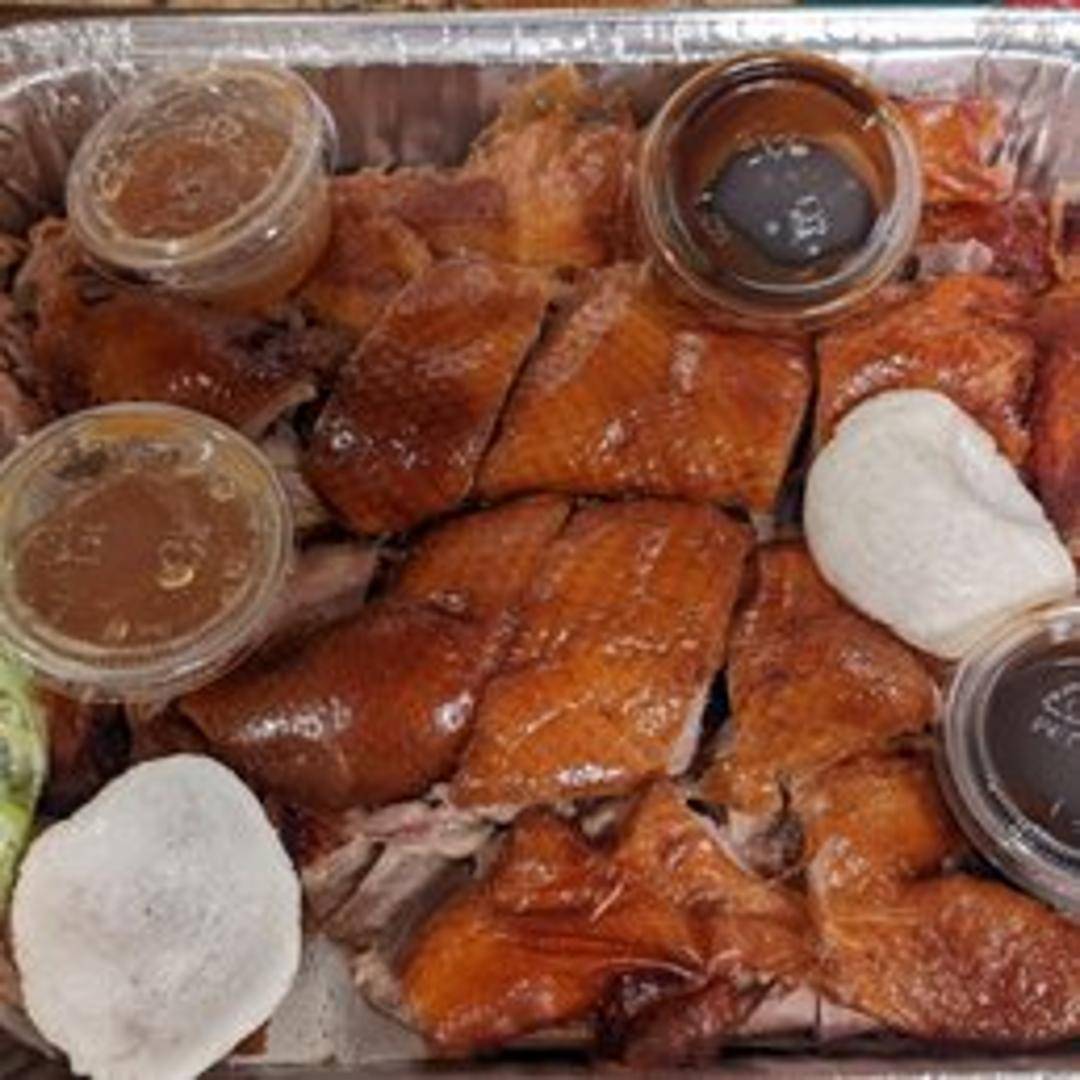 Classic Peking duck featuring crispy skin and tender meat, traditionally served with thin pancakes, scallions, and hoisin sauce. A multi-course experience, the remaining duck meat can be prepared in other dishes upon request (additional charge may apply).