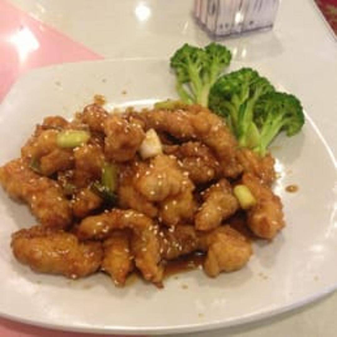 Crispy, bite-sized pieces of chicken coated in a sweet and tangy sesame sauce, served with a sprinkle of sesame seeds.