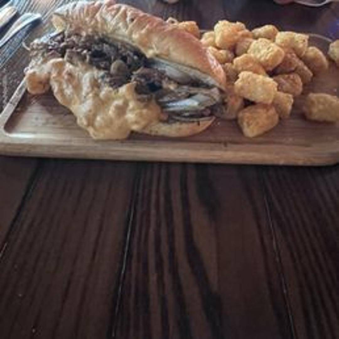 Thinly sliced steak, grilled with onions and peppers, topped with melted cheese on a toasted hoagie roll. Served with your choice of side.