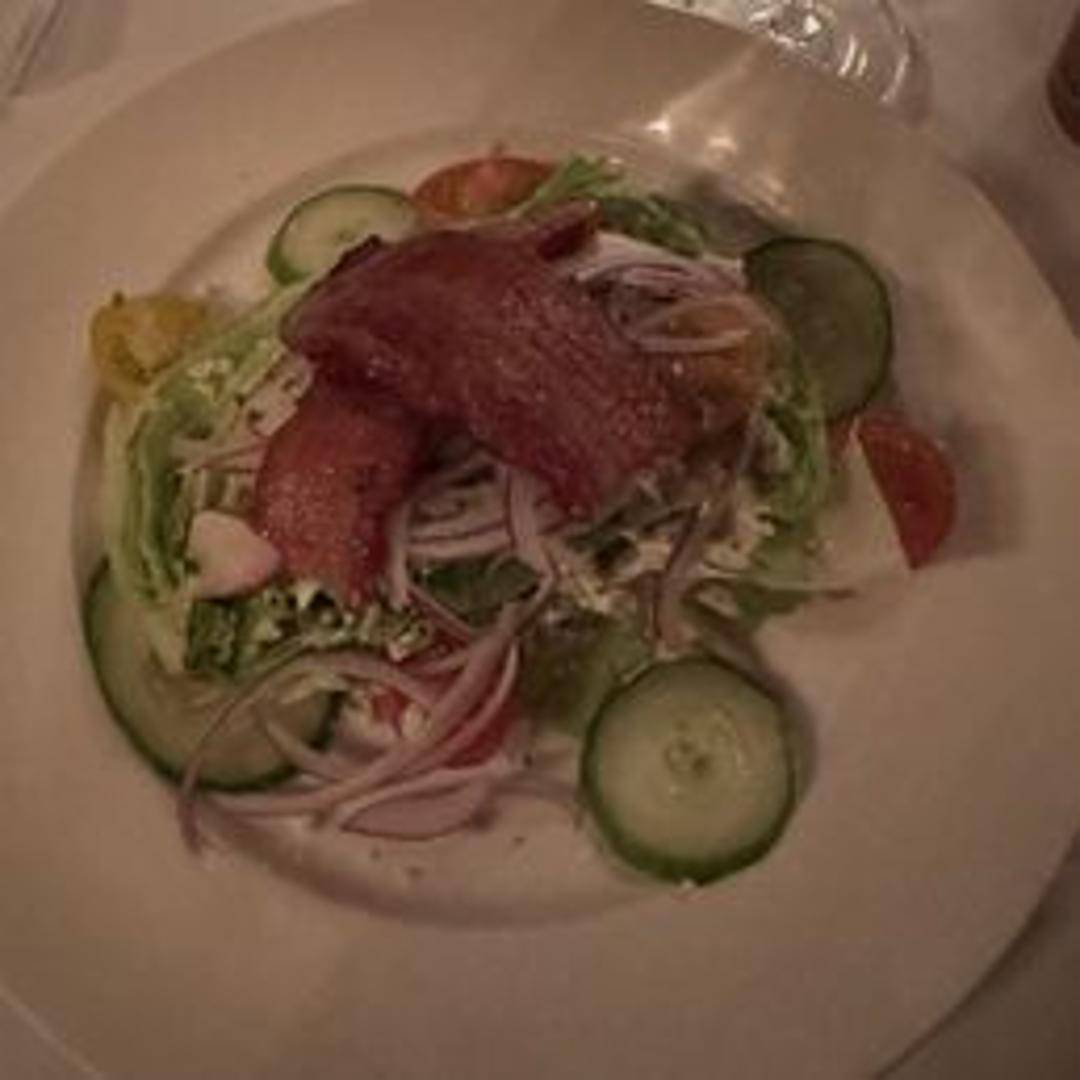A crisp wedge of iceberg lettuce, topped with creamy blue cheese dressing, crispy bacon, diced tomatoes, and red onion. A classic steakhouse starter.