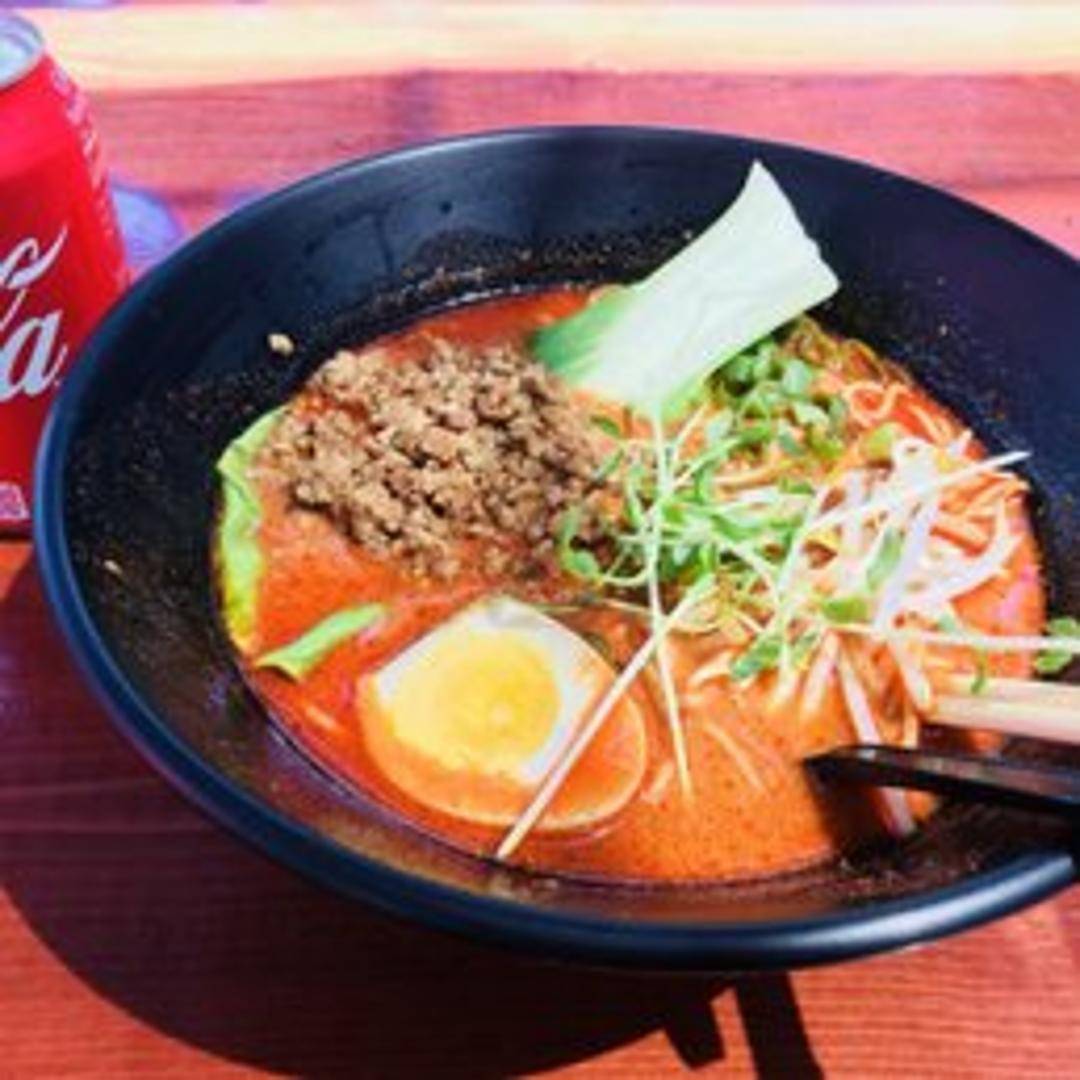 A flavorful and spicy Japanese noodle soup featuring chewy ramen noodles in a rich, savory broth. Garnished with a variety of toppings, such as sliced pork belly, a soft-boiled egg, seaweed, scallions, and bean sprouts. The broth is infused with chili oil and spices for a warming heat.