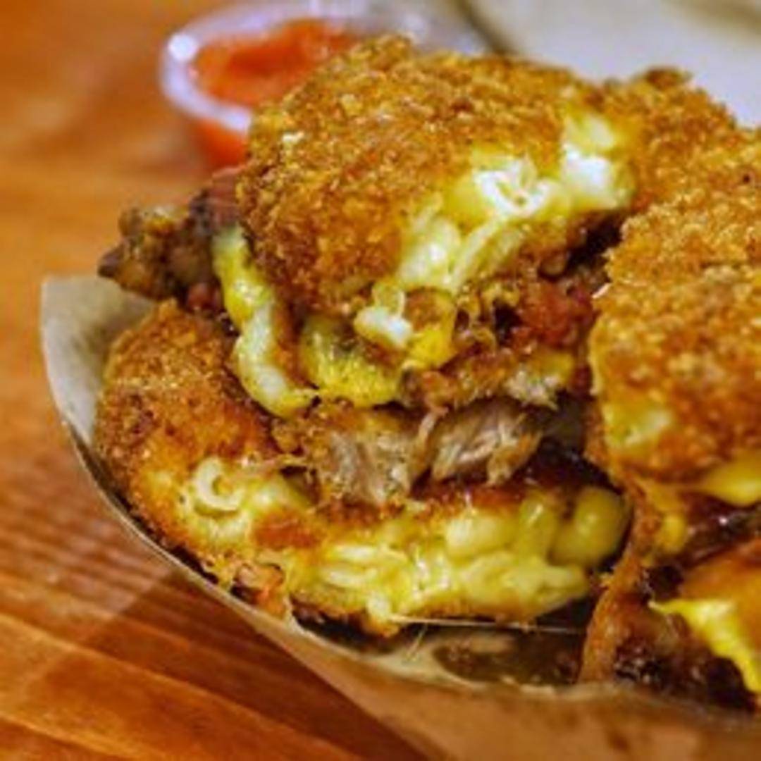 A juicy burger topped with macaroni and cheese. Expect a creamy, cheesy and filling experience.