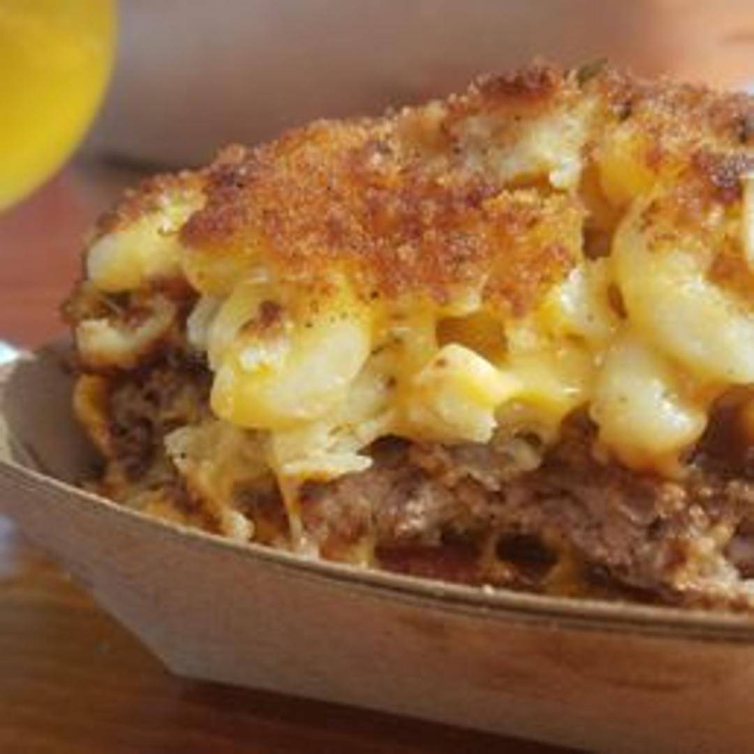 A hearty burger featuring a generous portion of macaroni and cheese as a topping. Expect a creamy, cheesy, and indulgent burger experience.