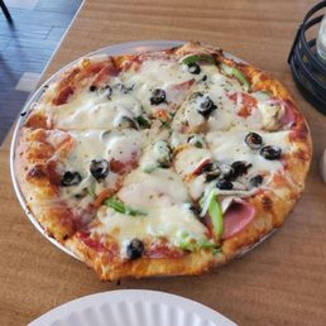 10-inch pizza topped with pepperoni, sausage, green peppers, onions, mushrooms, and black olives.
