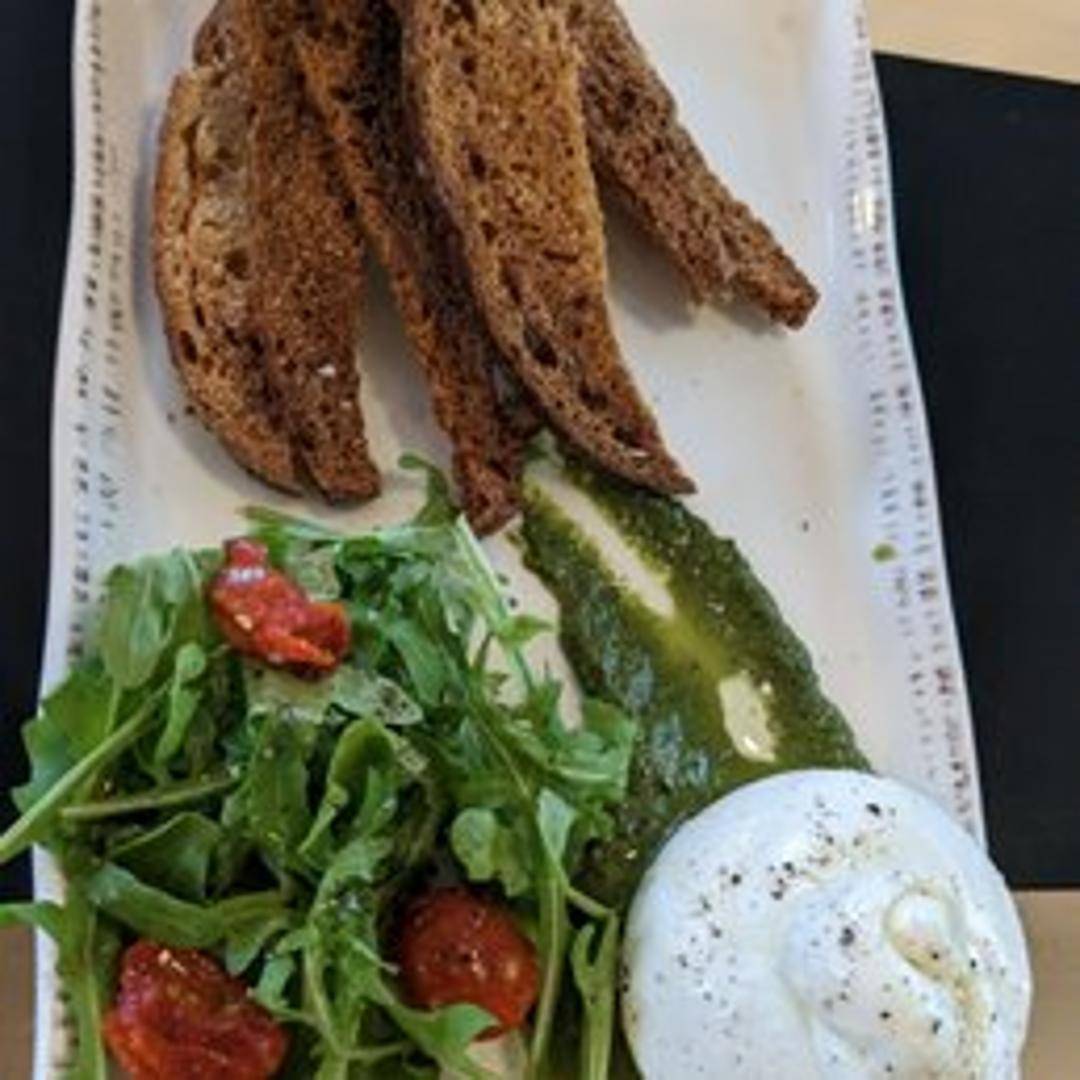 Fresh Italian cheese made from mozzarella and cream. The outer shell is solid mozzarella, while the inside contains stracciatella and cream, giving it a rich, buttery flavor.