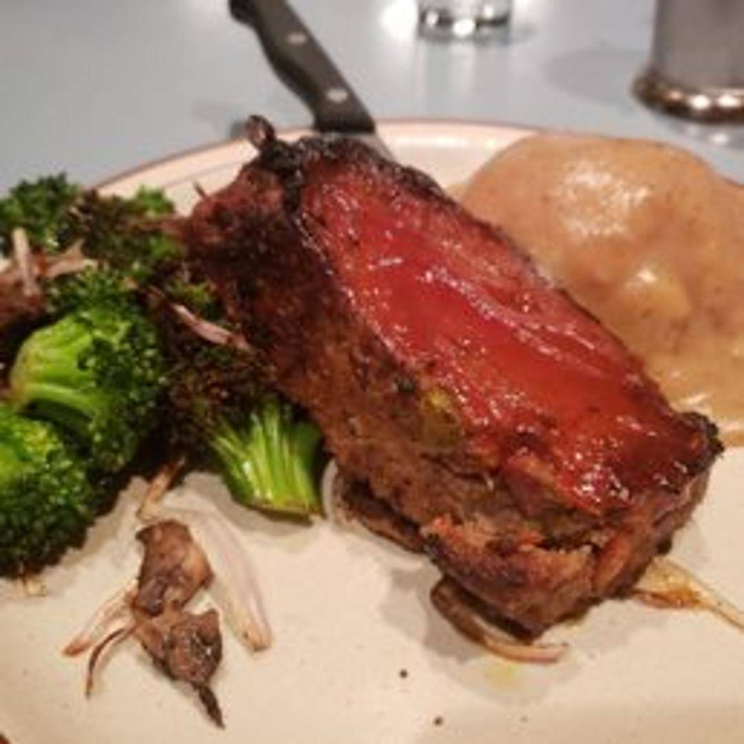 Homestyle meatloaf served with mashed potatoes, gravy, and a seasonal vegetable.