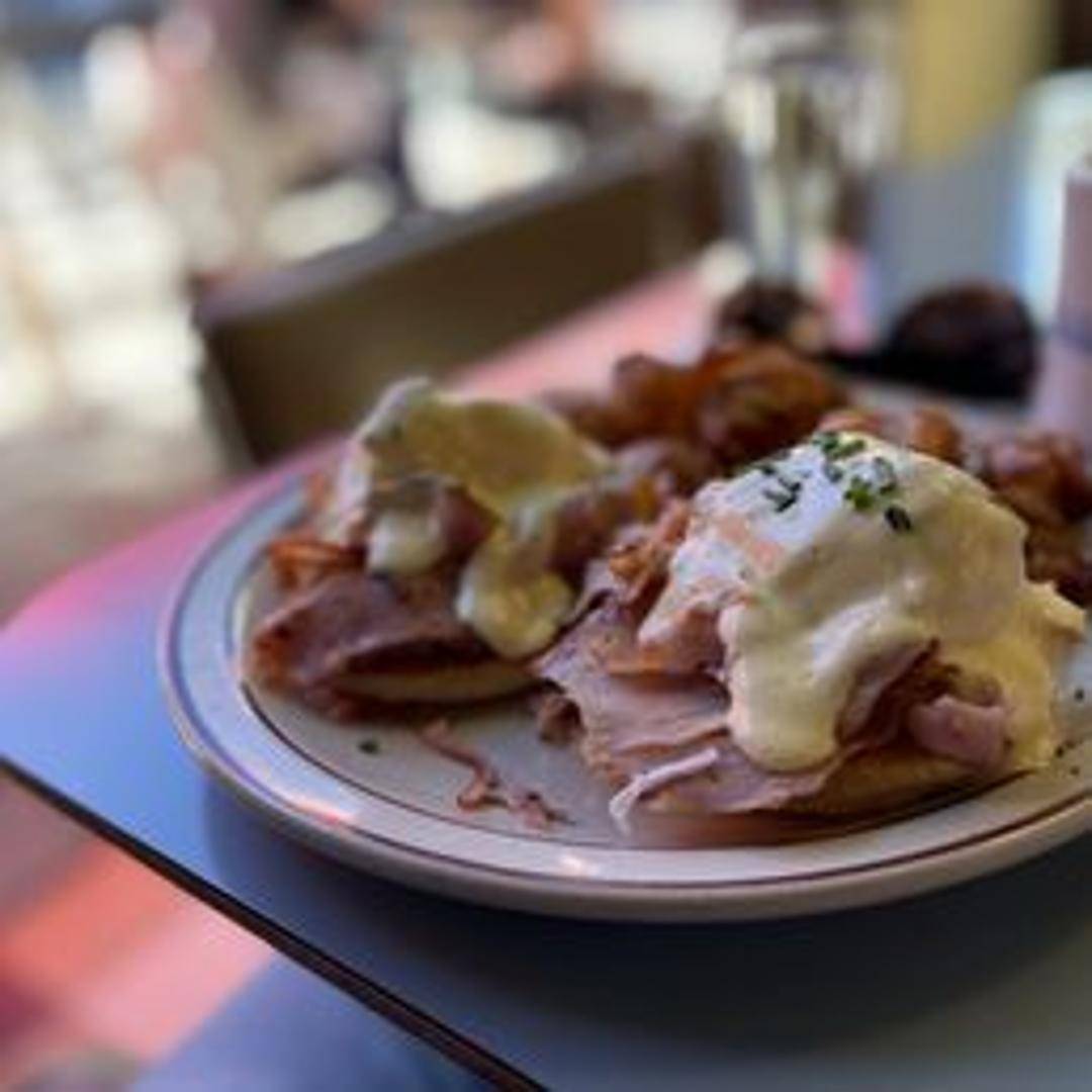 Two poached eggs served atop toasted English muffins with grilled tomatoes and spinach, topped with hollandaise sauce. Served with a side of breakfast potatoes.