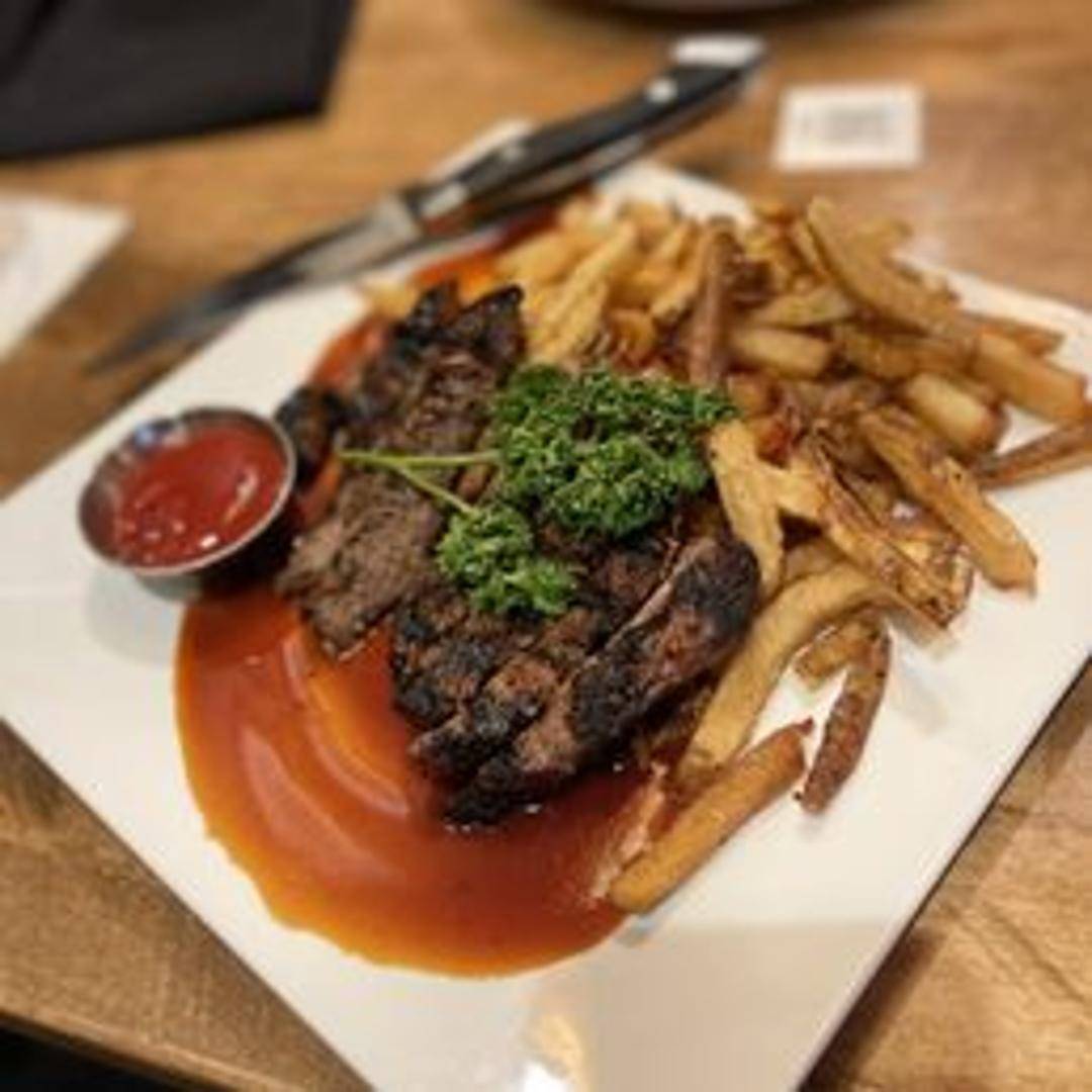 A classic bistro favorite featuring a perfectly cooked, tender steak (such as sirloin or hanger) seasoned and seared to your preferred temperature. It is traditionally served alongside a generous portion of golden, crispy French fries, offering a delightful contrast in texture and flavor. Often accompanied by a savory house-made sauce like a rich demi-glace, herb butter, or a vibrant chimichurri, and a simple side salad.