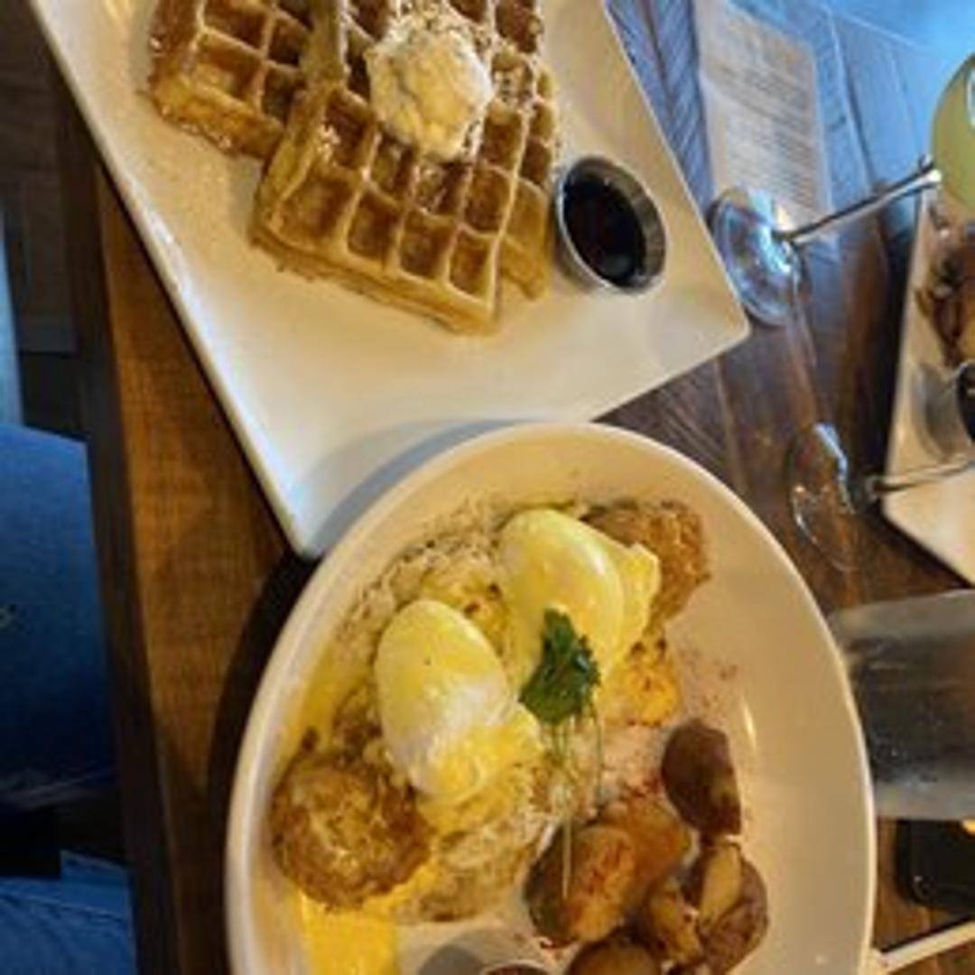 A refined take on the classic brunch favorite, featuring succulent shrimp and tender lump crab meat layered atop perfectly toasted English muffins. Each is crowned with delicately poached eggs and generously draped in a rich, velvety hollandaise sauce, offering a harmonious blend of flavors and textures in every decadent bite.