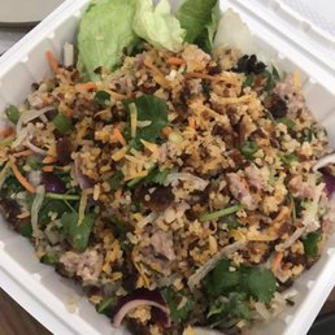 A textural delight of crispy coconut rice mixed with fermented pork, red onions, green onions, cilantro, peanuts, mint, lettuce, and a flavorful lime dressing.