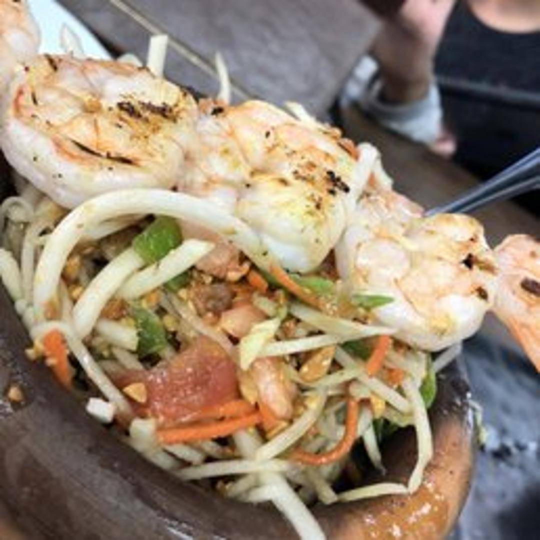 A refreshing and vibrant salad featuring juicy mango slices, succulent grilled prawns, crisp vegetables, and a tangy lime dressing. Garnished with toasted peanuts and fresh herbs.
