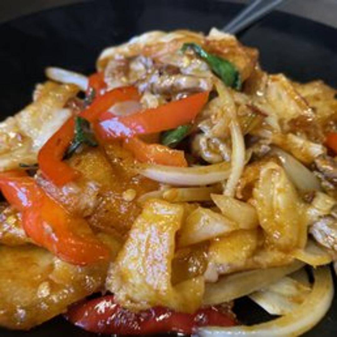 Wide rice noodles stir-fried with chicken, shrimp, or tofu, mixed with chili, garlic, basil, bell peppers, onions, and a sweet and savory drunken sauce, then topped with crispy noodles for a satisfying crunch.