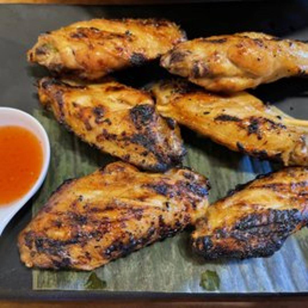 Grilled chicken wings, marinated in a sweet and tangy BBQ sauce, threaded onto skewers. Served hot and ready to eat, perfect as an appetizer or a satisfying snack. Often garnished with sesame seeds and green onions.