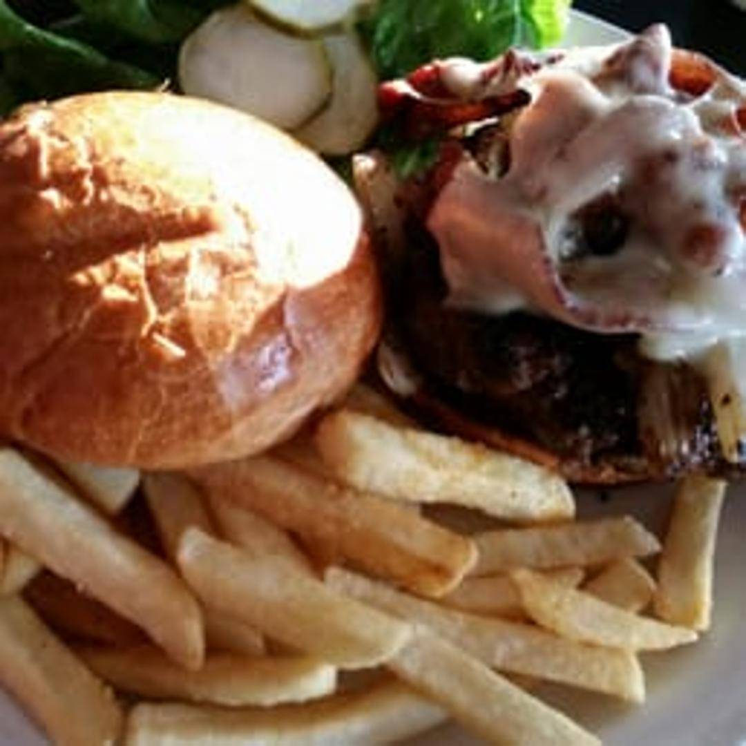 A classic, hearty hamburger featuring a juicy beef patty cooked to perfection. Served on a toasted bun with crisp lettuce, ripe tomato, sliced onion, pickles, and your choice of cheese. Comes with your choice of side.