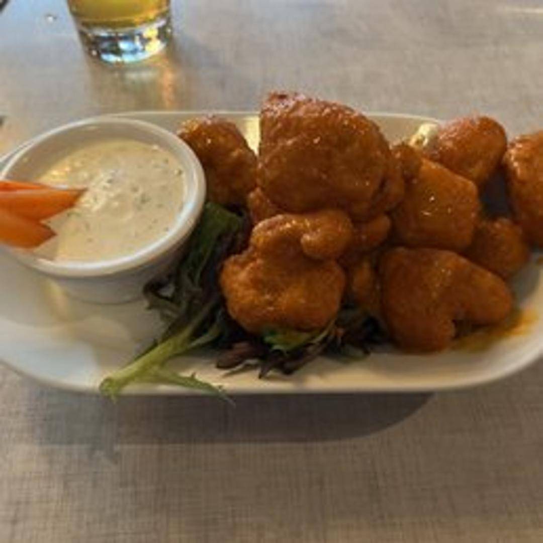 Tender cauliflower florets, breaded and baked to perfection, then tossed in our signature spicy buffalo sauce. Served with a side of blue cheese or ranch dressing and celery sticks. Perfect for sharing!