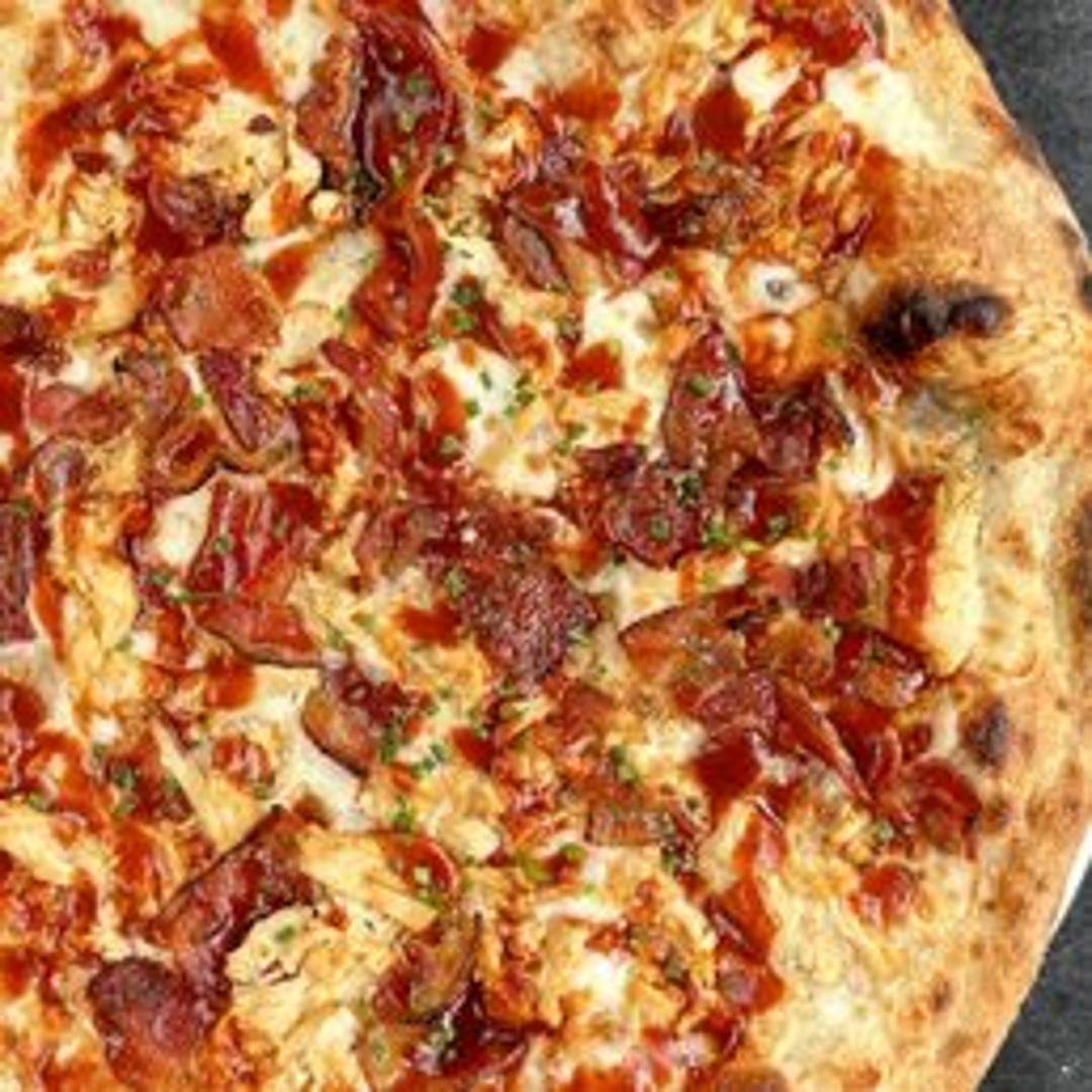 A delicious pizza featuring a tangy BBQ sauce base, topped with grilled chicken, crispy bacon, red onions, and a blend of melted cheeses.