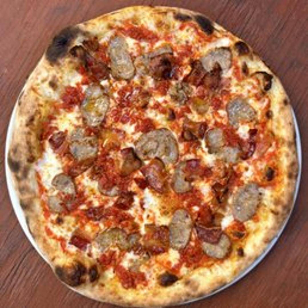 A carnivore's delight! This pizza features a tomato sauce base, mozzarella cheese, savory sausage, crispy bacon, and smoky ham.