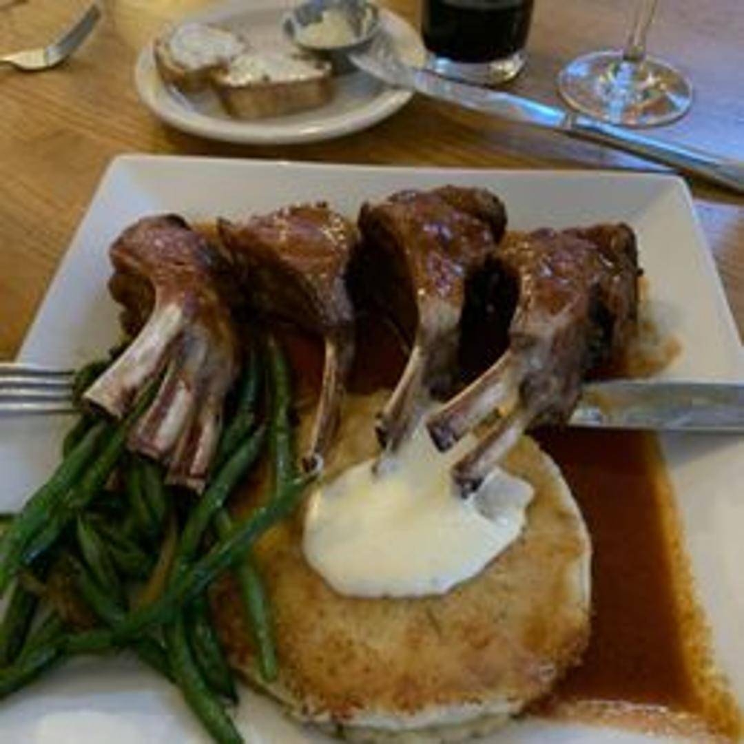 Roasted rack of lamb, expertly seasoned and cooked to perfection, served with a complementary sauce and seasonal vegetables.
