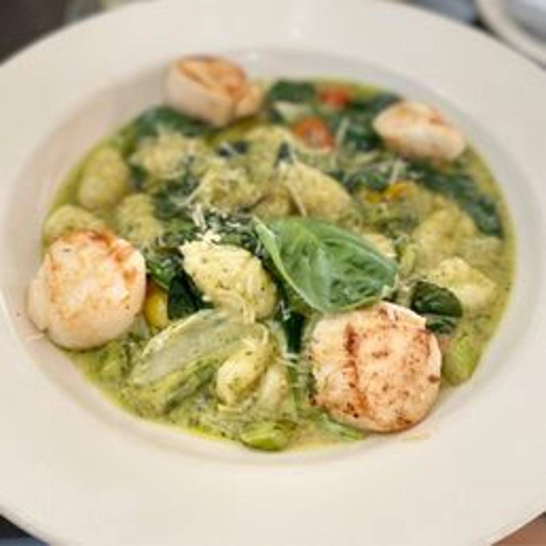 Pan-seared scallops served atop pillowy potato gnocchi in a light, creamy sauce. Garnished with fresh herbs and a hint of citrus.