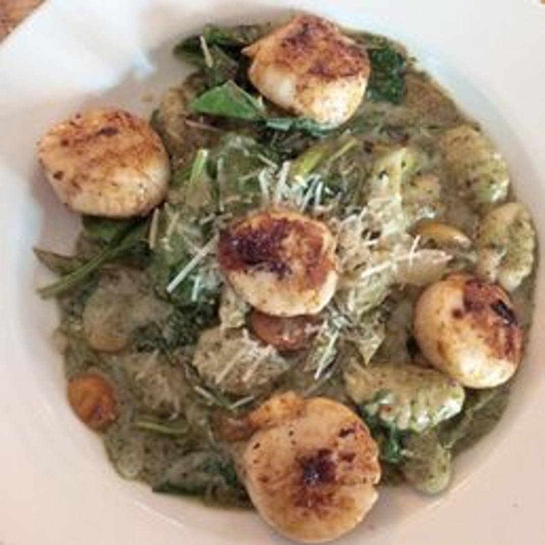 Pan-seared scallops served atop tender potato gnocchi, tossed in a vibrant basil pesto sauce. Garnished with Parmesan cheese.