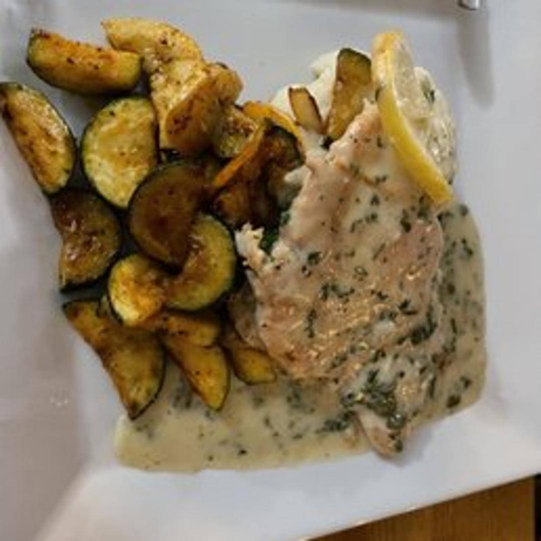 Pan-seared chicken breast in a lemon-butter sauce with capers, served with your choice of side.