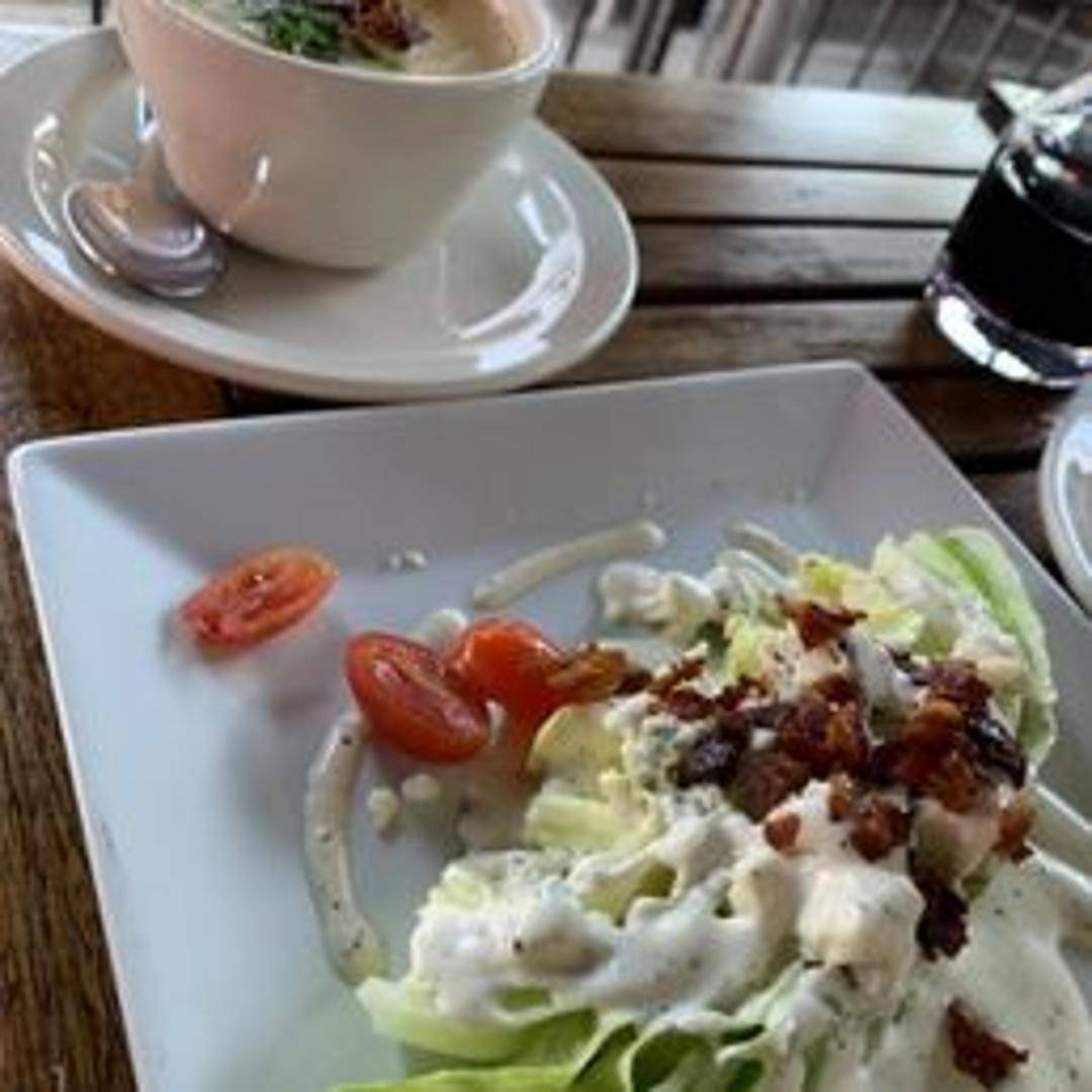 A crisp wedge of iceberg lettuce topped with creamy blue cheese dressing, bacon crumbles, diced tomatoes, and red onions.