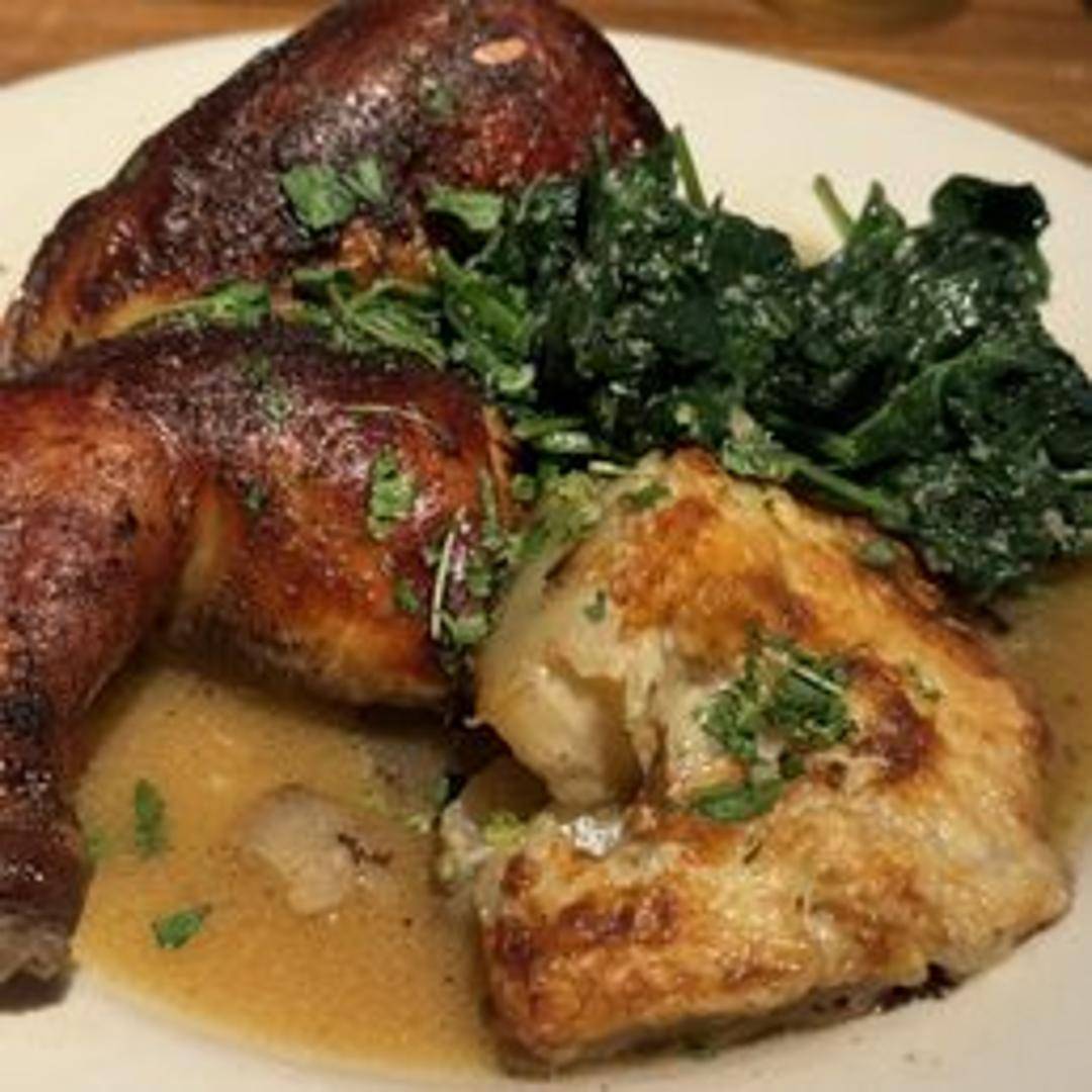A juicy and flavorful half-chicken, roasted to a golden brown and seasoned with herbs. Served with your choice of two sides.