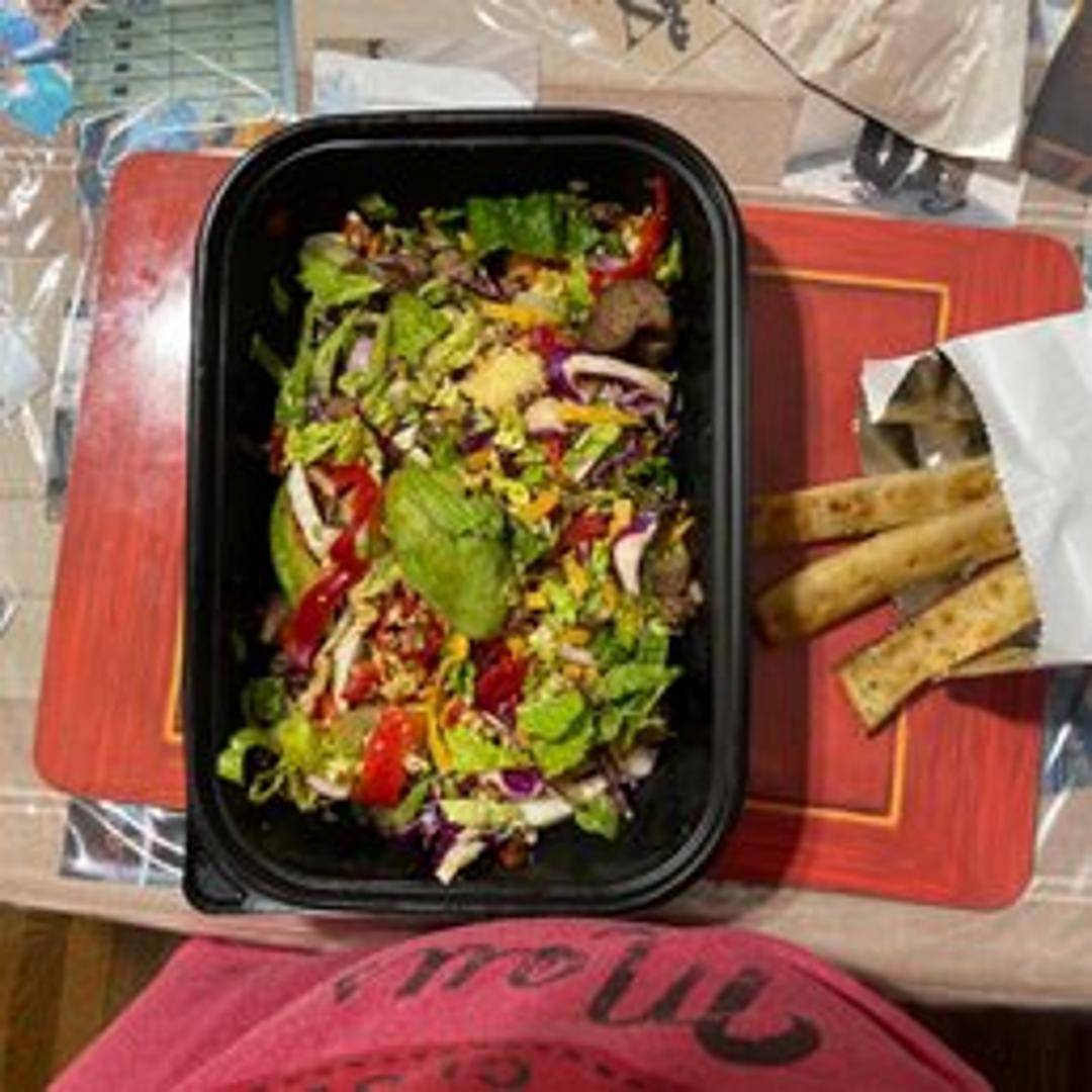 Grilled chicken breast, black beans, corn, cheddar cheese, tomatoes, tortilla strips, and mixed greens with a creamy cilantro dressing.