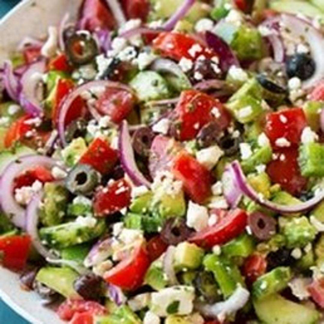 A refreshing salad with crisp lettuce, tomatoes, cucumbers, onions, Kalamata olives, feta cheese, and a tangy Greek dressing.