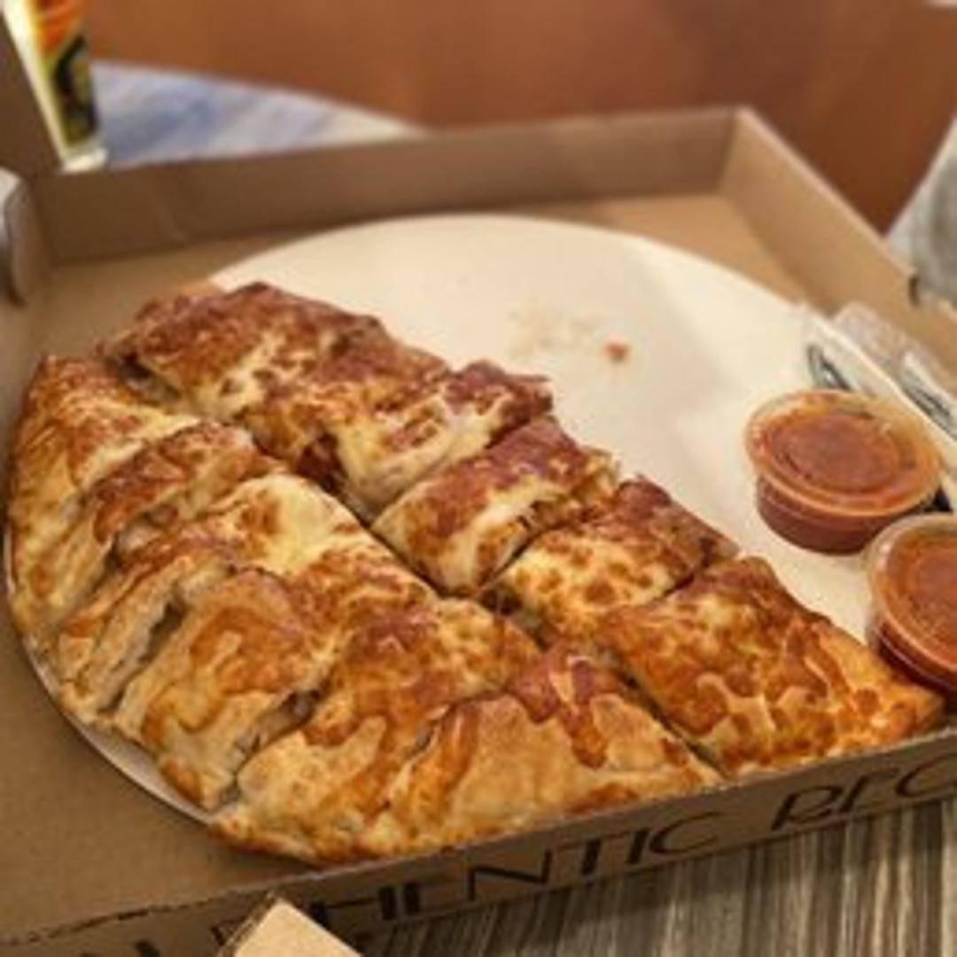 A pizza dough turnover filled with breaded chicken, marinara sauce, mozzarella cheese, and ricotta cheese, baked until golden brown.