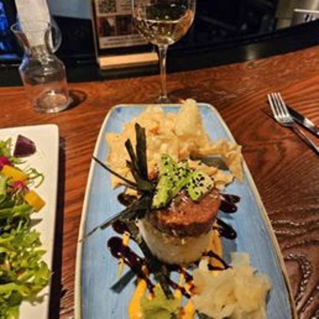A layered tower of diced Ahi tuna, avocado, seaweed salad, and crispy wonton chips. Drizzled with a sesame-ginger dressing.