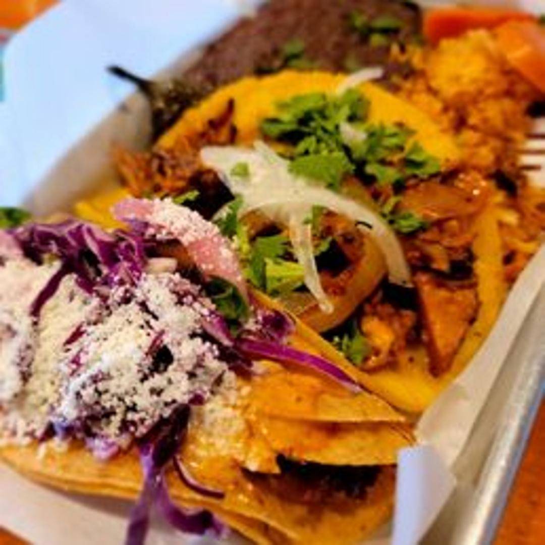 A selection of two or three tacos of your choice, served with a side of rice and beans.