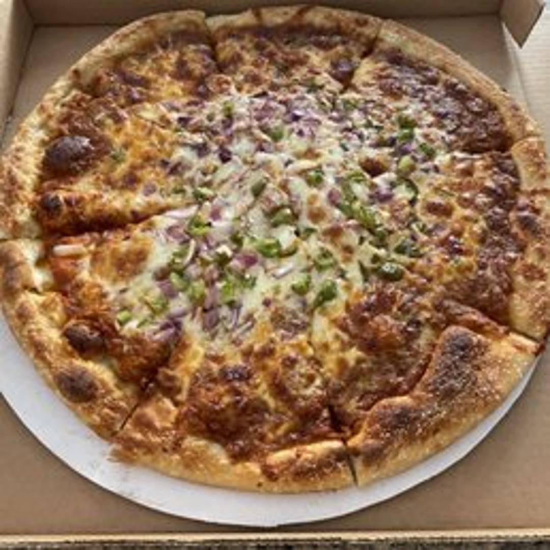 A pizza inspired by the popular Indian street food, Pav Bhaji. The crust is spread with a spiced tomato and potato based bhaji (a flavorful vegetable mash), topped with mozzarella cheese. Garnished with freshly chopped onions, cilantro, and a squeeze of lemon juice for a tangy and savory pizza experience.