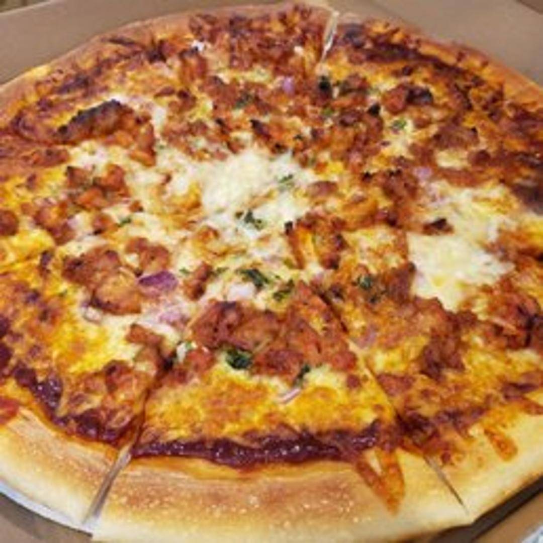 A fusion pizza featuring a crispy crust topped with a savory Manchurian sauce, tender pieces of marinated chicken, fresh vegetables like bell peppers and onions, and a blend of mozzarella and cheddar cheese. A flavorful blend of Indo-Chinese cuisine on a classic pizza base.