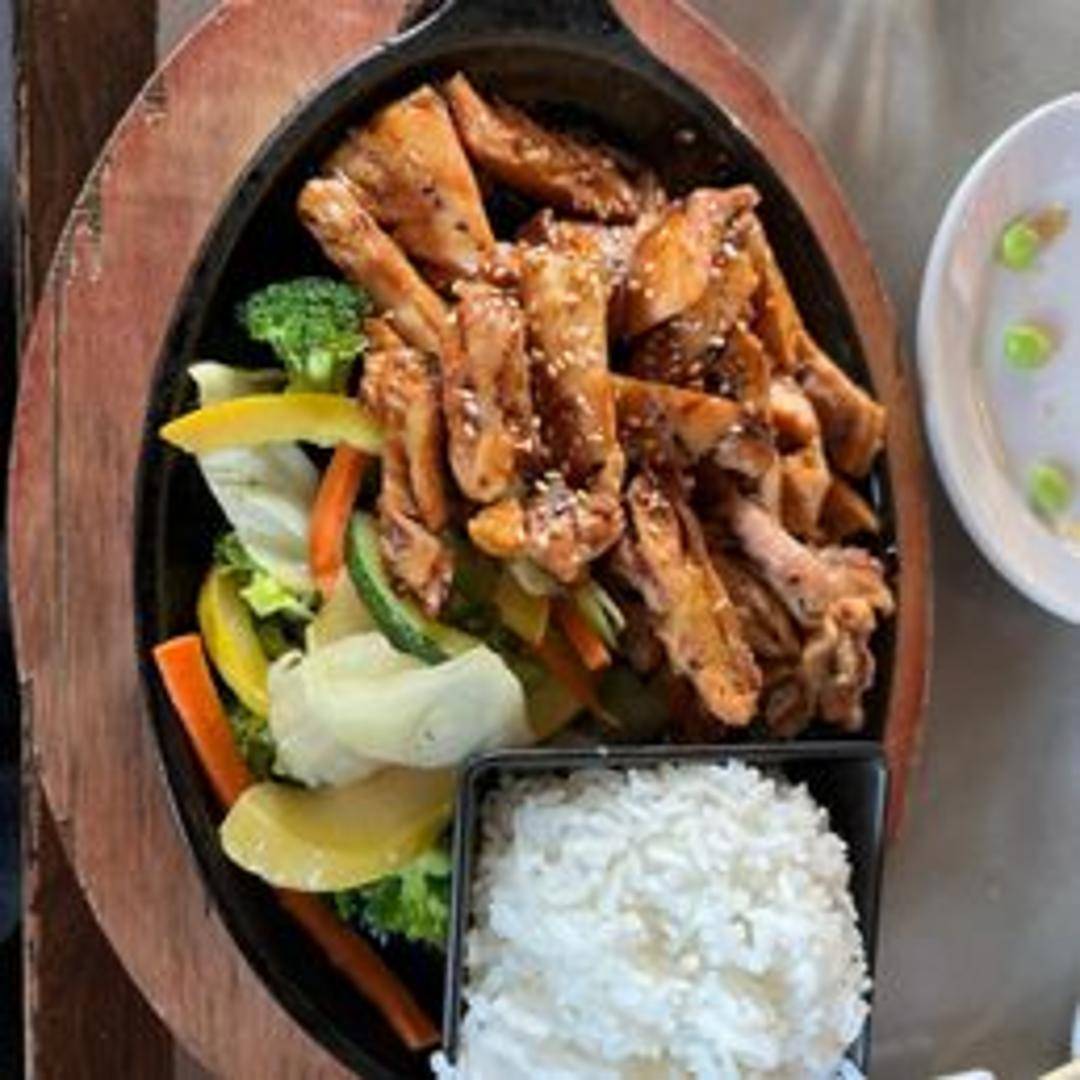 Grilled chicken glazed with a sweet and savory teriyaki sauce, typically served with rice and vegetables.