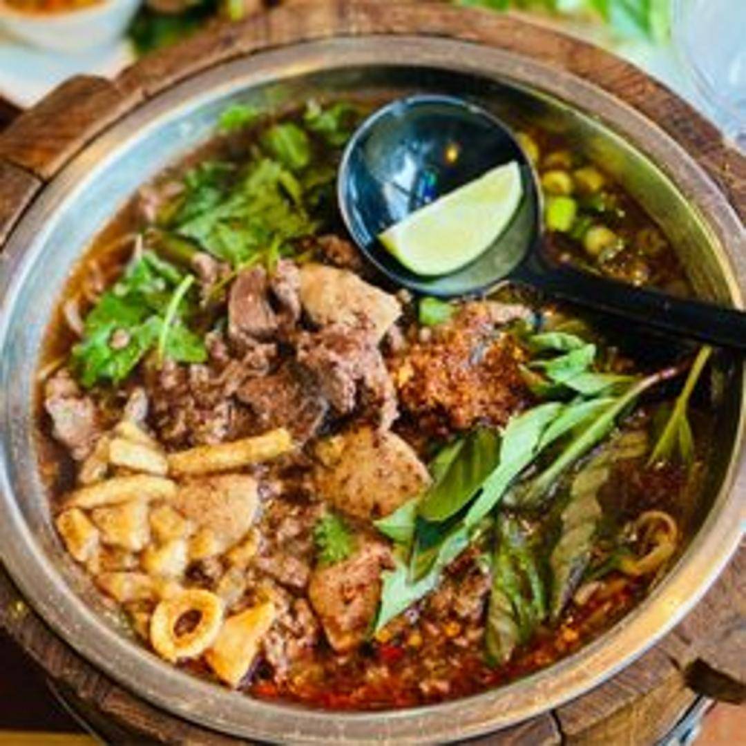 A flavorful and intricate noodle soup featuring a rich broth, a variety of vegetables, and your choice of protein. The complex layering of spices and herbs creates a truly unique and satisfying culinary experience. Garnished with fresh herbs and crispy toppings.