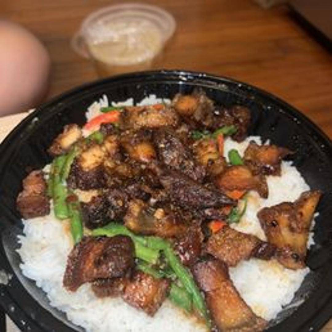 Perfectly rendered and crisped pork belly, seasoned with savory spices. The skin is shatteringly crisp while the meat remains tender and juicy. Served with a dipping sauce, often a sweet and tangy dark soy sauce or chili vinegar.